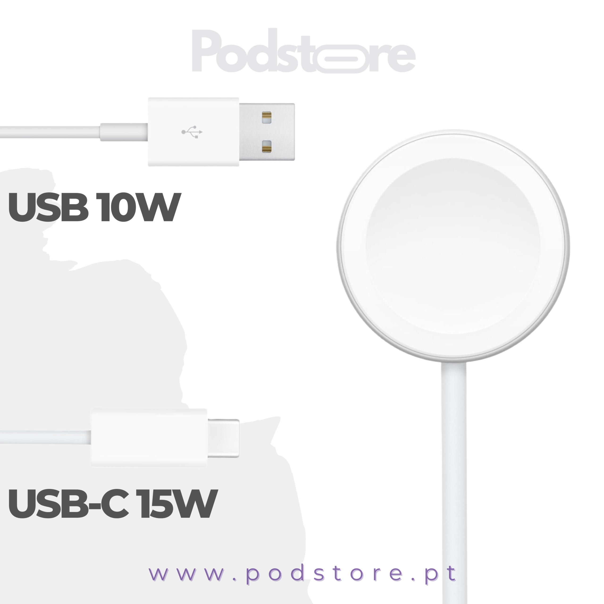 🔋 Opções de Carregamento Disponível nas versões USB de 10W e USB-C de 15W, garantindo um carregamento rápido e seguro para o teu Apple Watch.