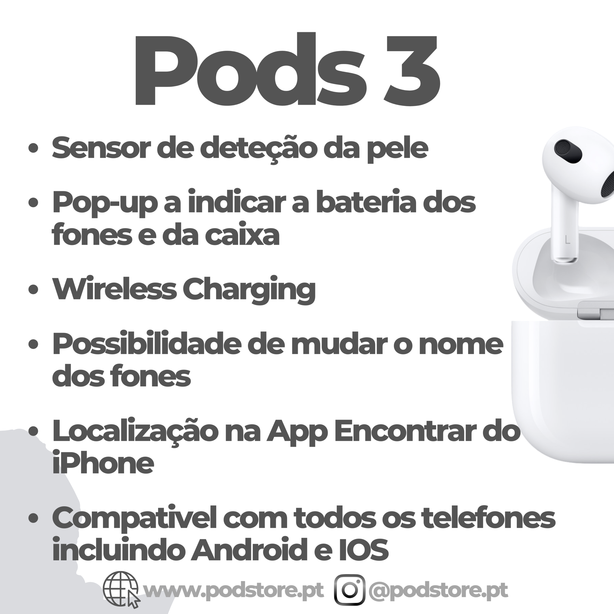 Apresentamos os Pods 3, desenvolvidos com componentes selecionados para garantir a mais alta qualidade de som e de construção, os nossos Pods são a melhor opção do mercado para quem procura uns fones com alta qualidade de som e design.