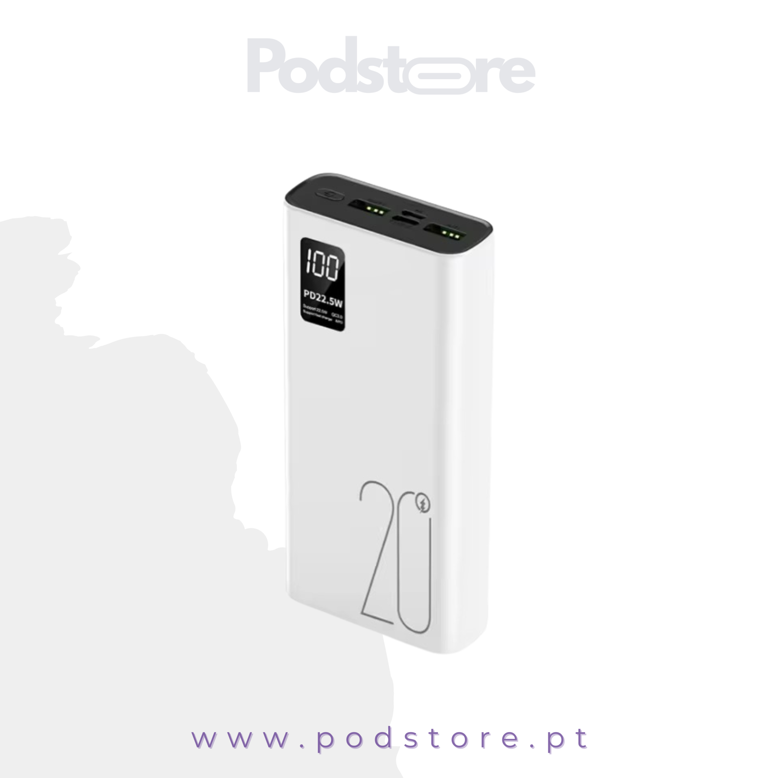 Powerbank 20000mAh PD 22.5W com múltiplas portas (2x USB-A, 1x USB-C entrada/saída e Micro-USB) para carregares vários dispositivos ao mesmo tempo com rapidez e segurança.